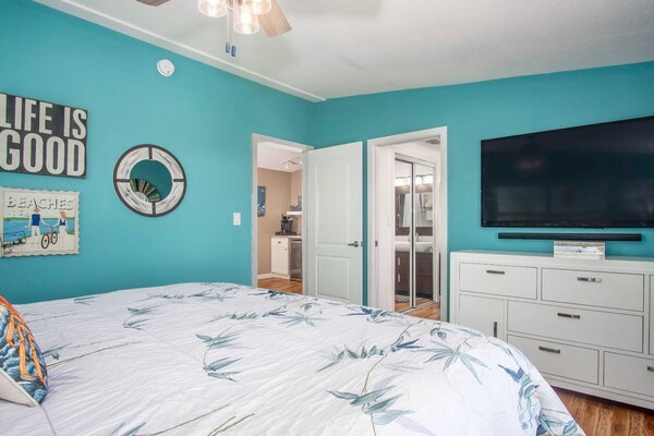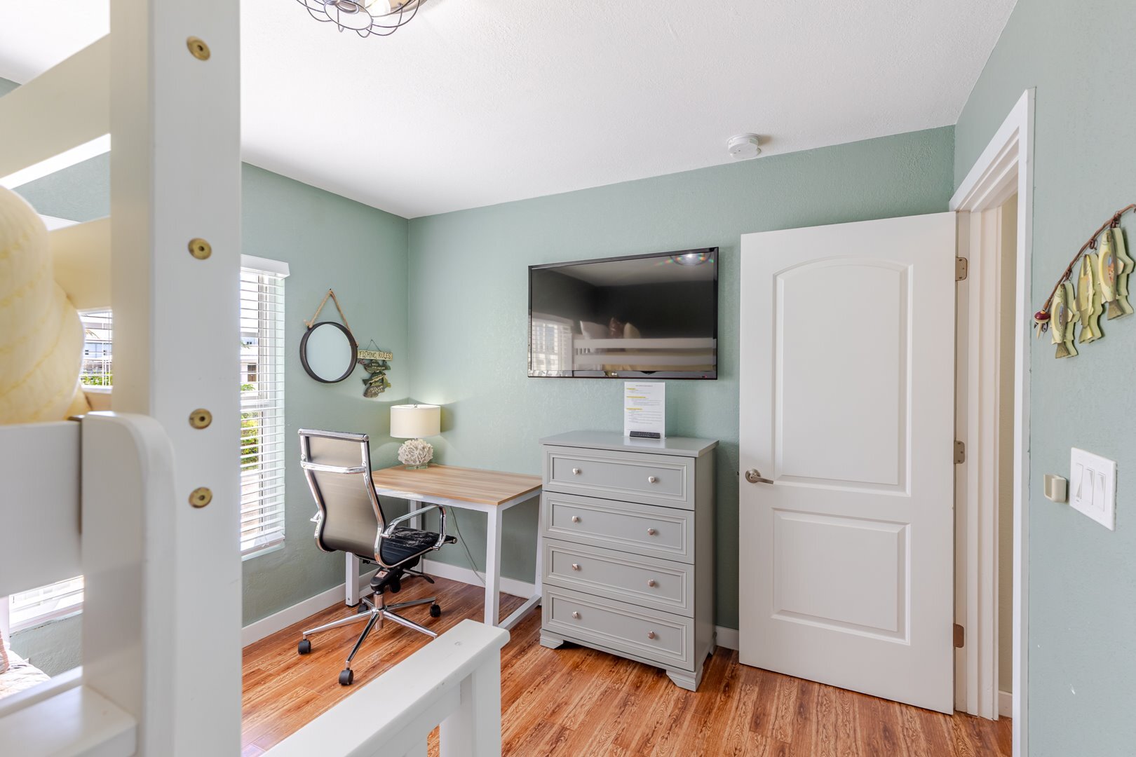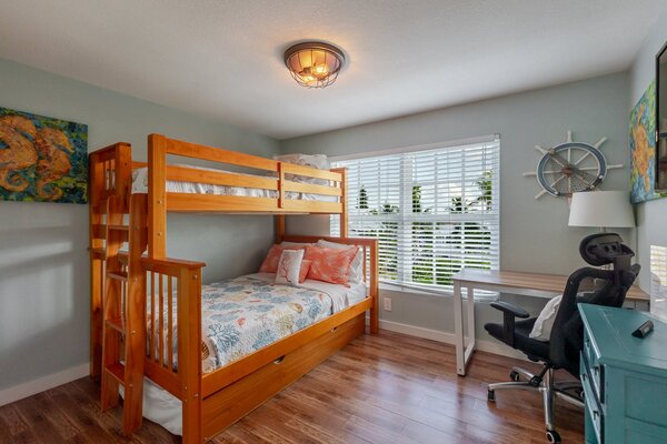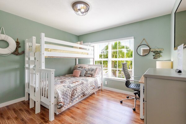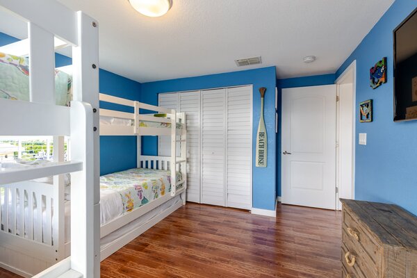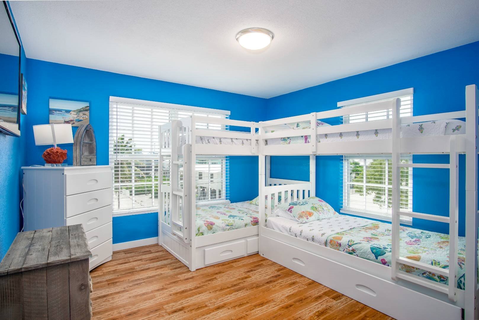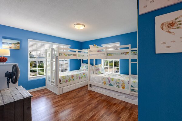 The second level unveils yet another living space, a convenient mini bar area, and four additional bedrooms accompanied by three well-appointed bathrooms. The first two bedrooms on this level serve as master suites, each featuring a regal king-size bed and an expansive en suite bathroom. The third bedroom boasts two sets of twin bunk bed trundles, perfect for accommodating multiple guests. The fourth bedroom mirrors the playful design of the first level, offering a pyramid bunk bed with a trundle configuration (featuring a twin on top, a full on the bottom, and an additional pull-out twin trundle).