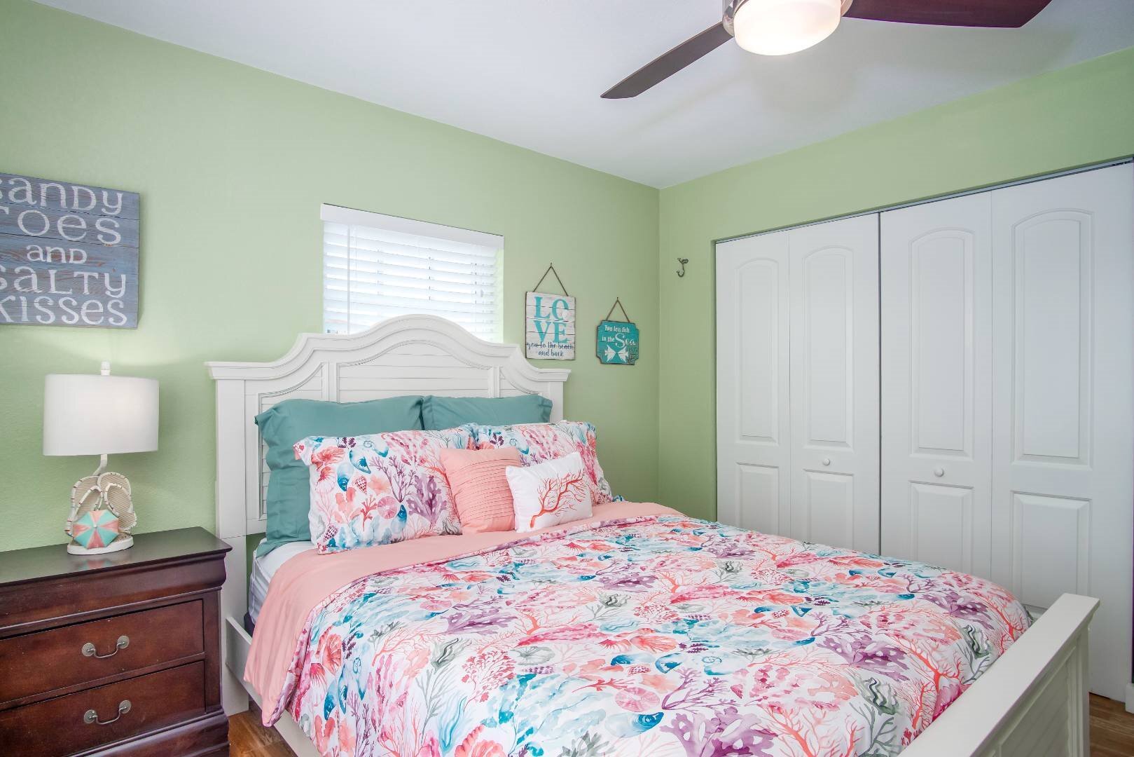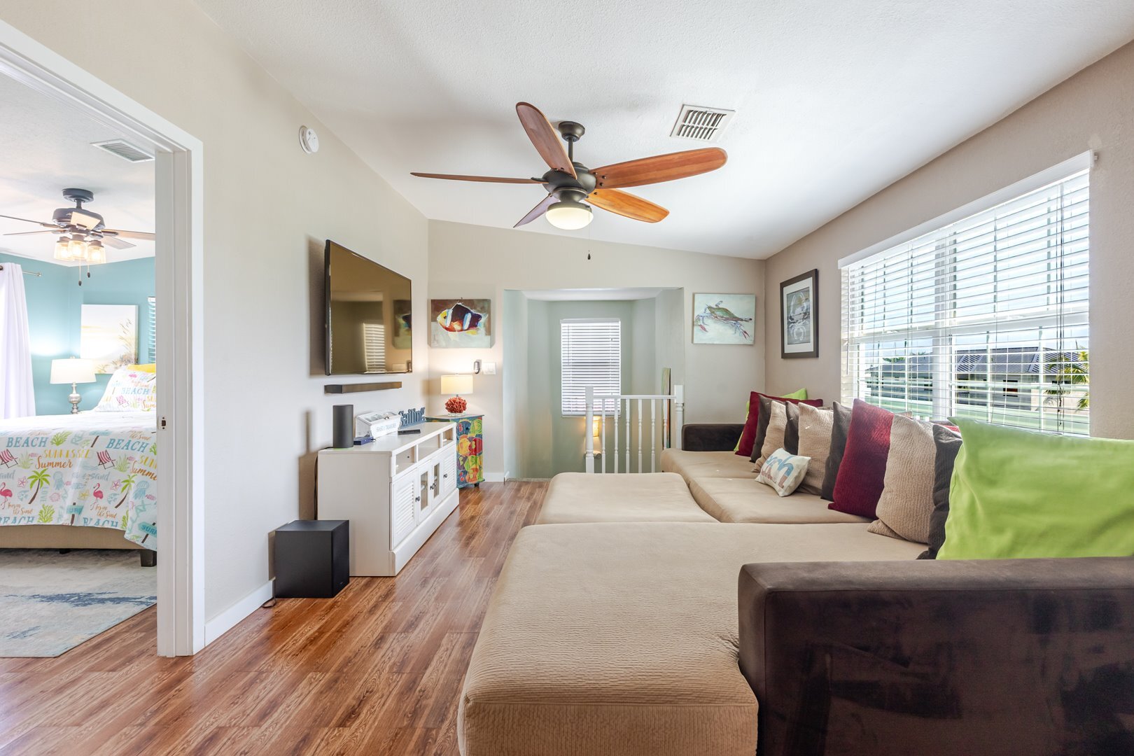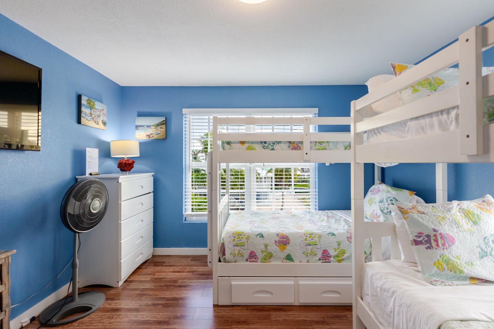 The second level unveils yet another living space, a convenient mini bar area, and four additional bedrooms accompanied by three well-appointed bathrooms. The first two bedrooms on this level serve as master suites, each featuring a regal king-size bed and an expansive en suite bathroom. The third bedroom boasts two sets of twin bunk bed trundles, perfect for accommodating multiple guests. The fourth bedroom mirrors the playful design of the first level, offering a pyramid bunk bed with a trundle configuration (featuring a twin on top, a full on the bottom, and an additional pull-out twin trundle).