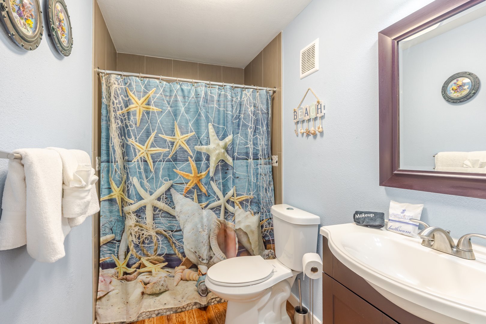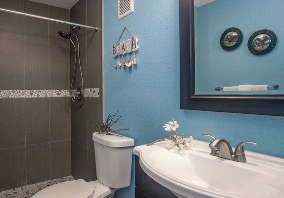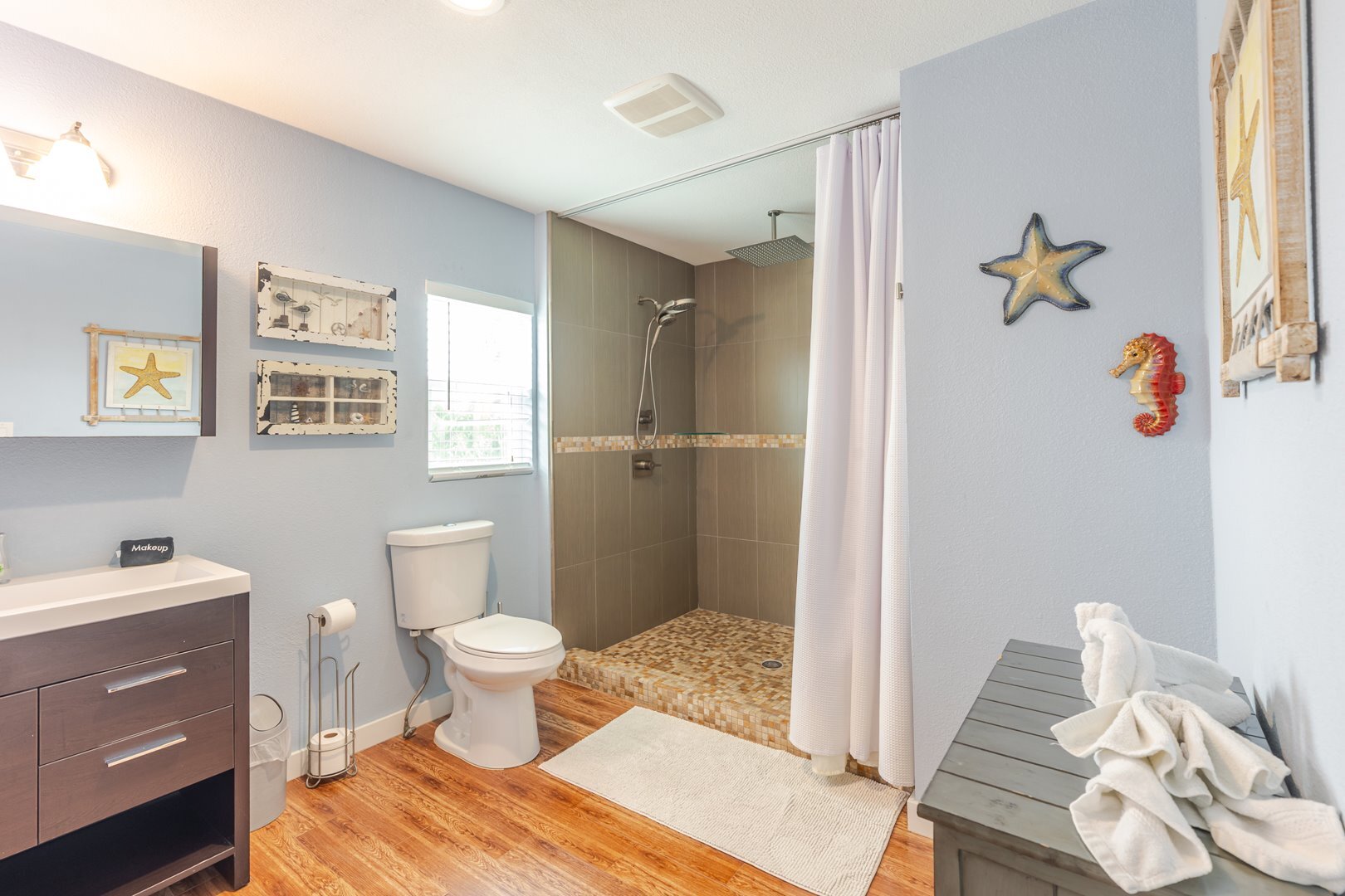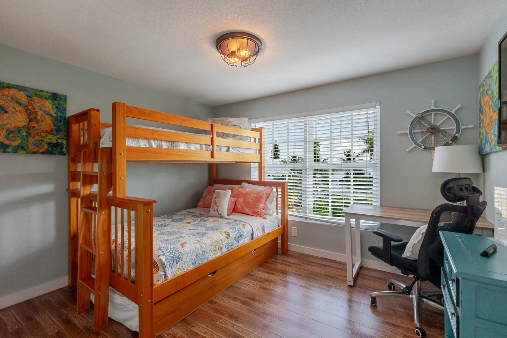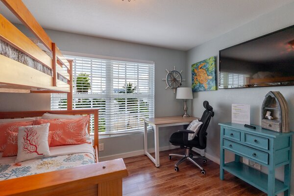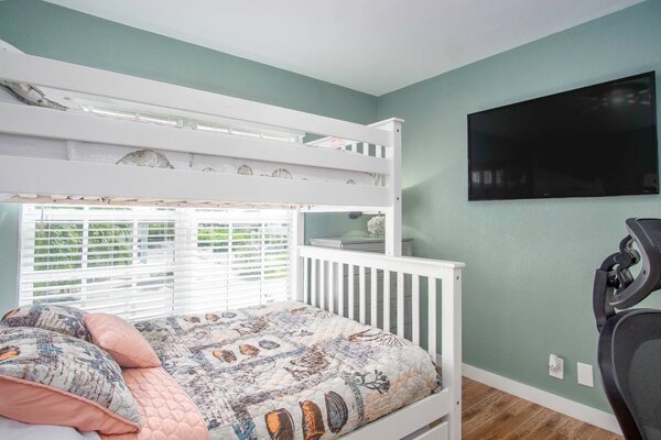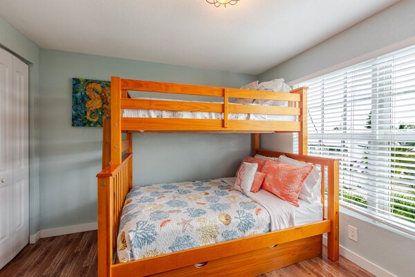 The main level of the home hosts the primary kitchen, a charming dining area, a welcoming living room, and three inviting bedrooms, complemented by a central hall bathroom. The first of these bedrooms offers a luxurious king-size bed and a spacious en suite bathroom, while the second bedroom features a cozy queen bed. The third bedroom caters to the younger crowd with a playful pyramid bunk bed equipped with a trundle (featuring a twin on top, a full on the bottom, and an additional pull-out twin trundle). The guest bathroom on this level is equipped with a refreshing shower.
