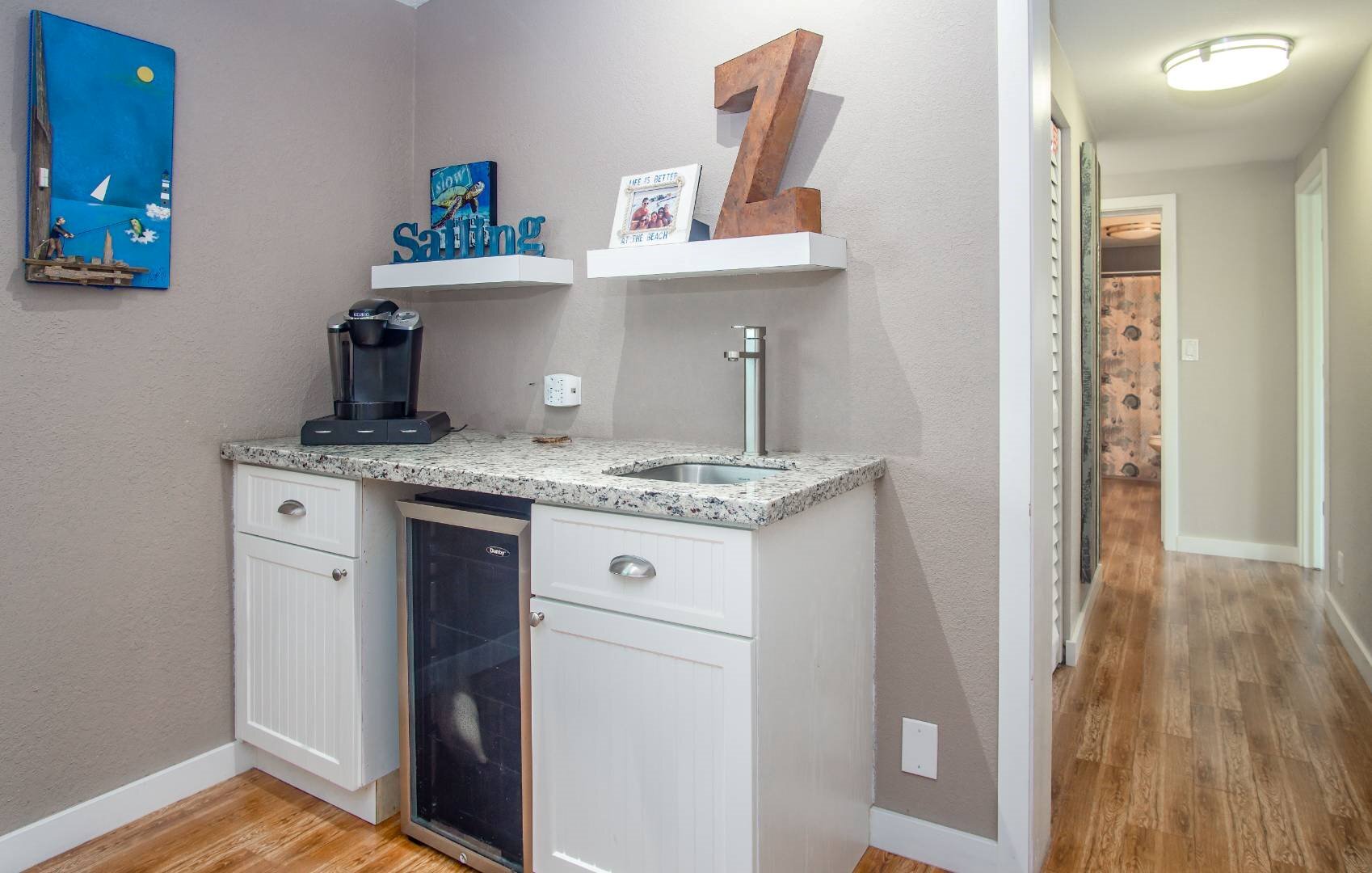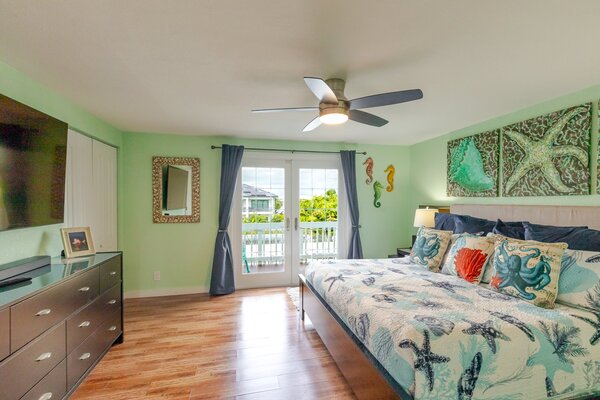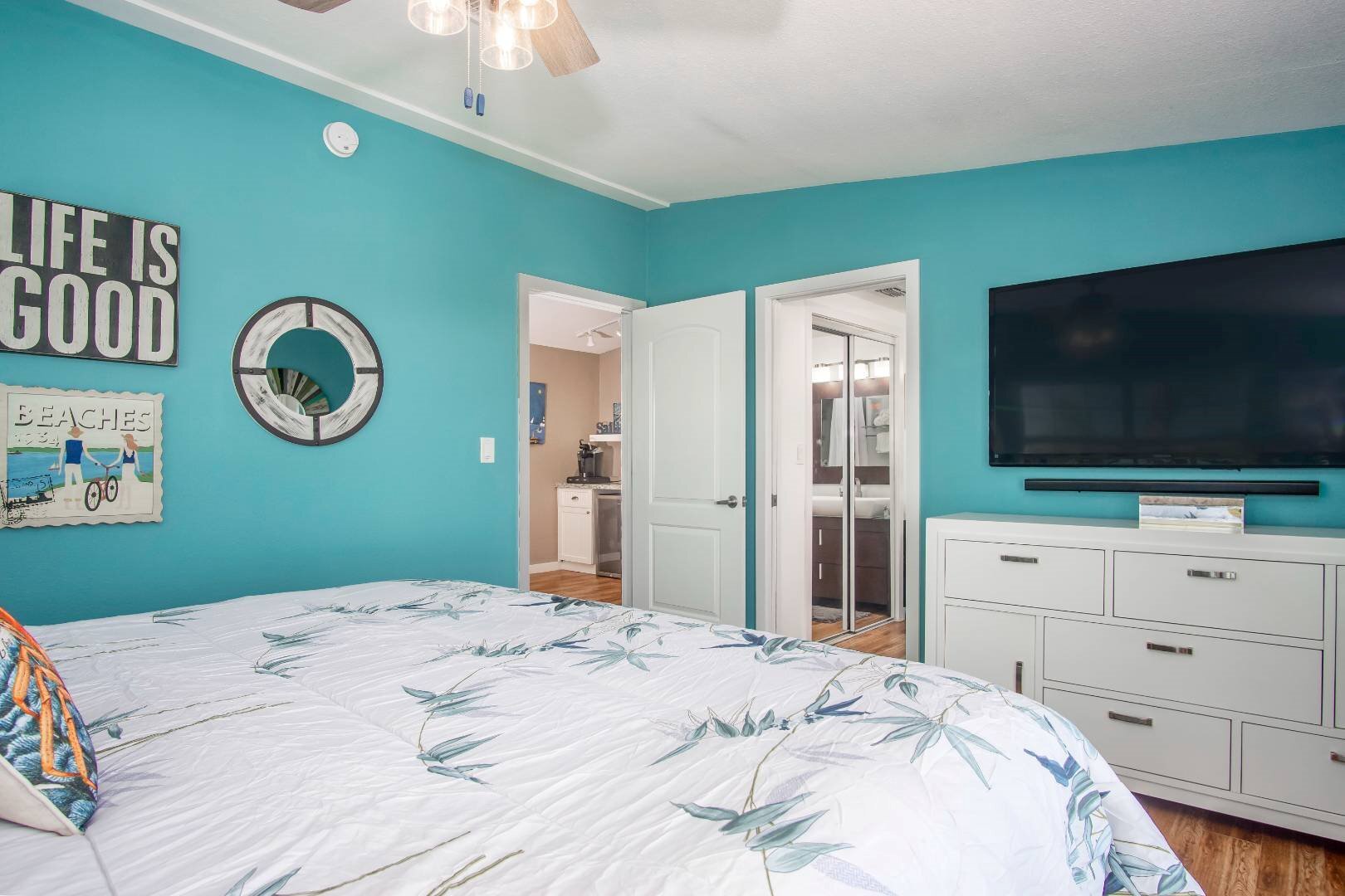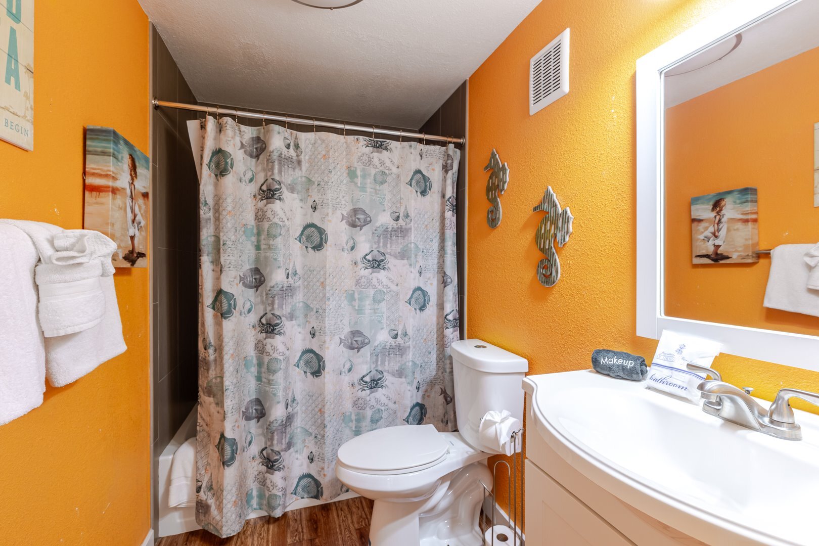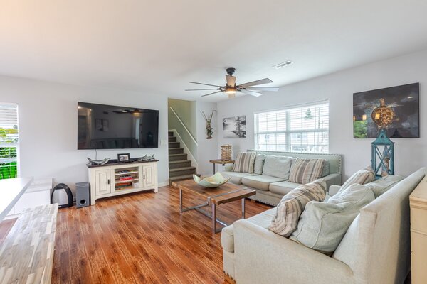 The main level of the home hosts the primary kitchen, a charming dining area, a welcoming living room, and three inviting bedrooms, complemented by a central hall bathroom. The first of these bedrooms offers a luxurious king-size bed and a spacious en suite bathroom, while the second bedroom features a cozy queen bed. The third bedroom caters to the younger crowd with a playful pyramid bunk bed equipped with a trundle (featuring a twin on top, a full on the bottom, and an additional pull-out twin trundle). The guest bathroom on this level is equipped with a refreshing shower.