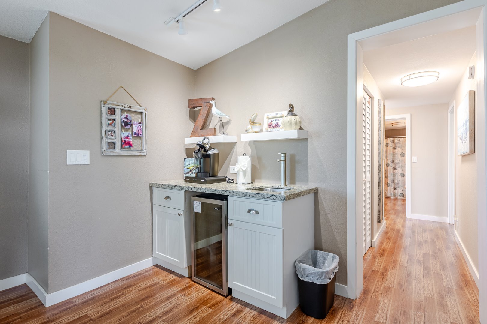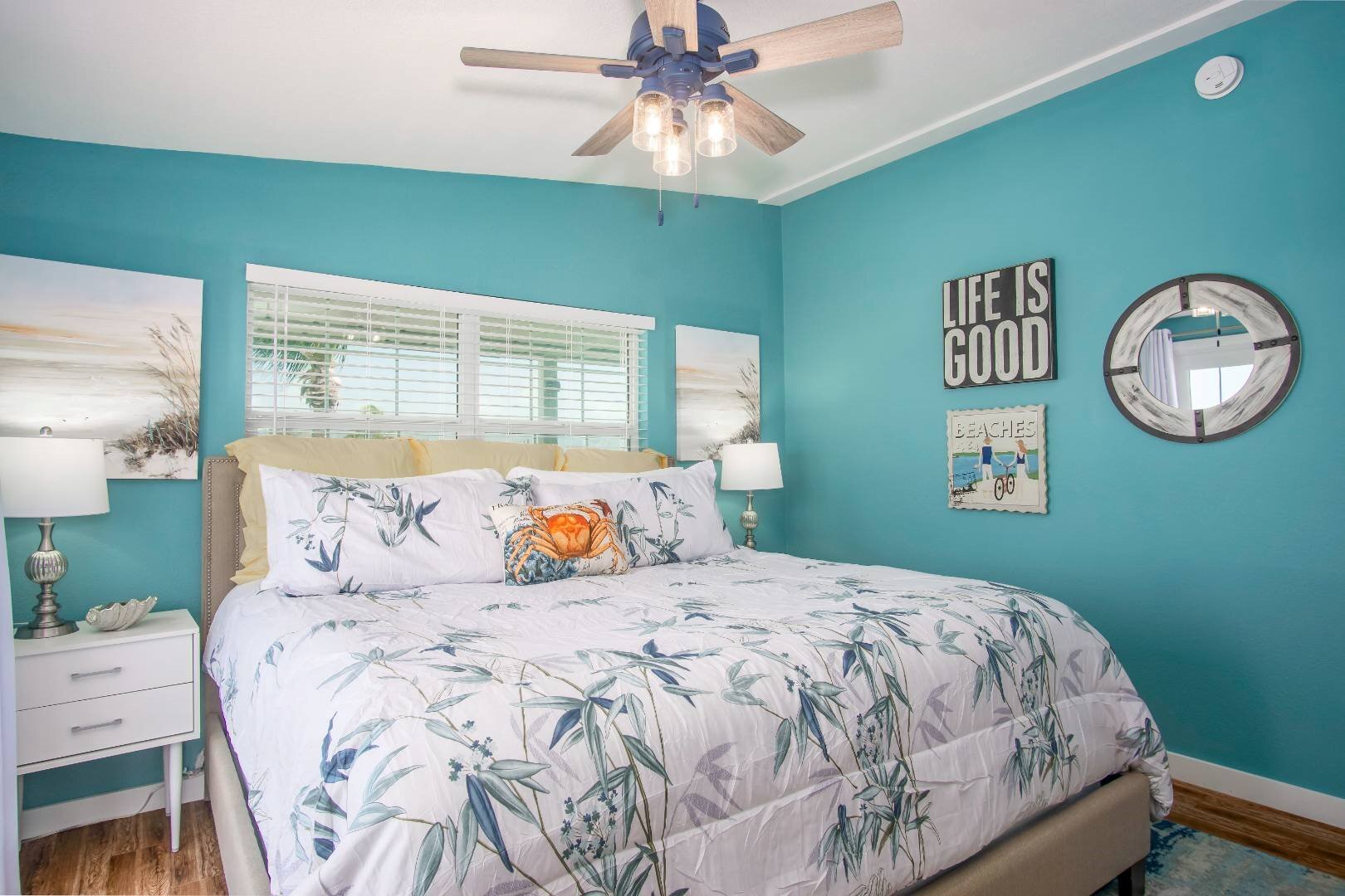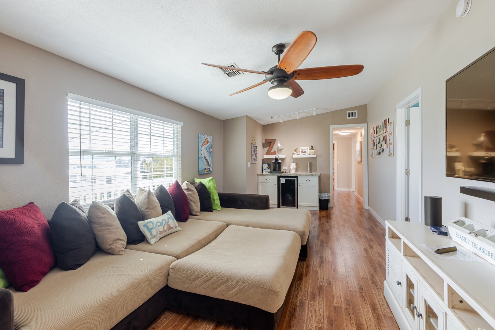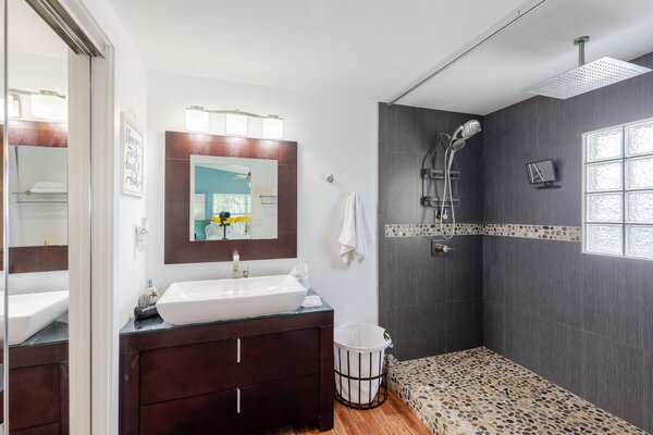 The main level of the home hosts the primary kitchen, a charming dining area, a welcoming living room, and three inviting bedrooms, complemented by a central hall bathroom. The first of these bedrooms offers a luxurious king-size bed and a spacious en suite bathroom, while the second bedroom features a cozy queen bed. The third bedroom caters to the younger crowd with a playful pyramid bunk bed equipped with a trundle (featuring a twin on top, a full on the bottom, and an additional pull-out twin trundle). The guest bathroom on this level is equipped with a refreshing shower.