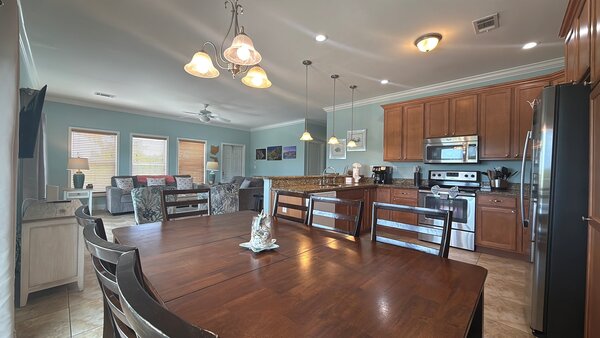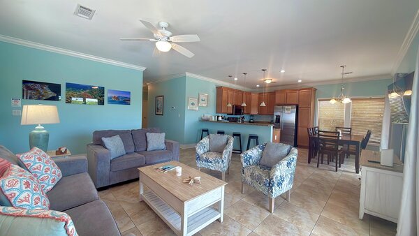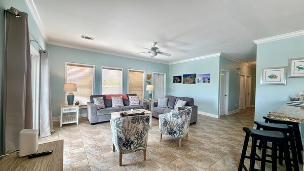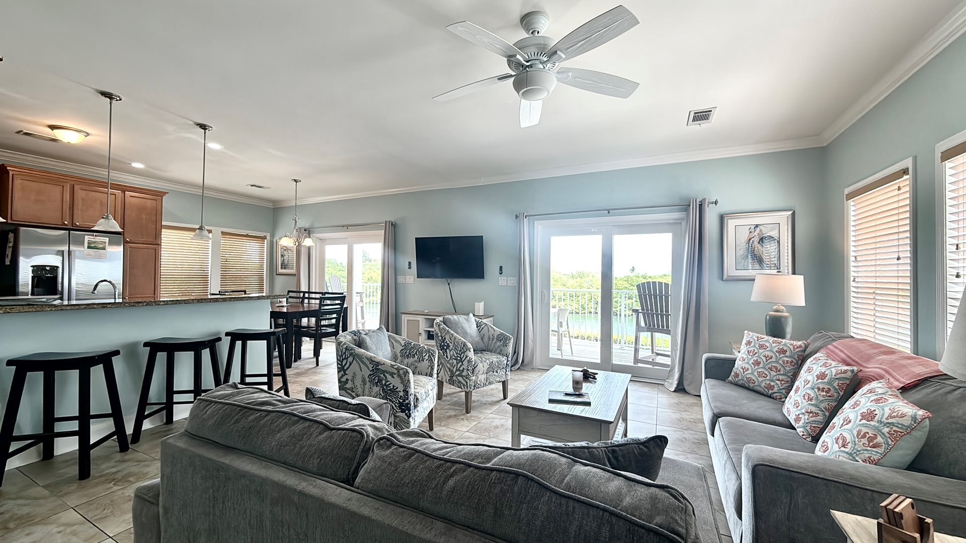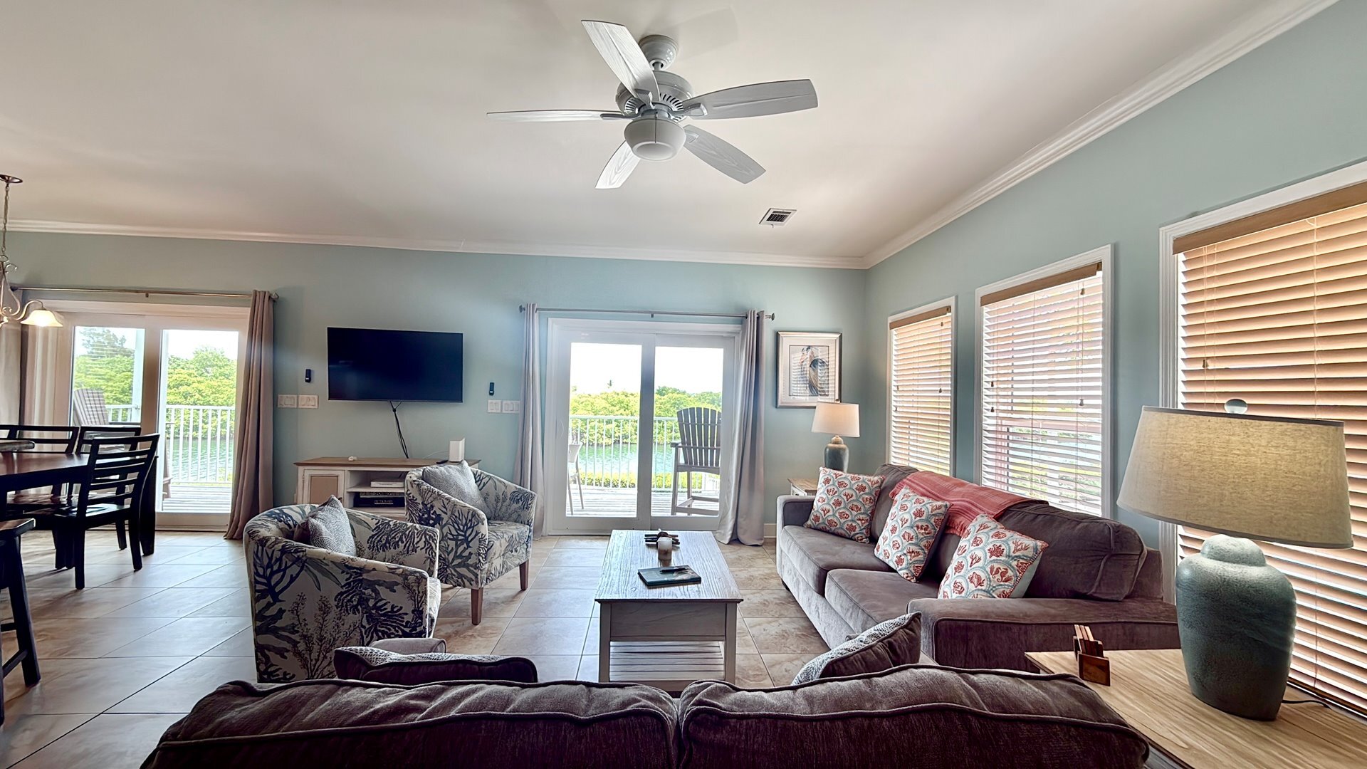Each 1,740 sq. ft. home boasts a spacious 4-bedroom, 3-bath layout, designed with an open floor plan that encourages relaxation and togetherness. The fully equipped kitchen, large laundry, and comfortable living areas are complemented by waterfront porches with stunning Bonefish Bay views. Enjoy high-speed wireless internet, 5 flat-screen TVs, and plenty of space for your vehicles and boat trailer (up to 37ft).